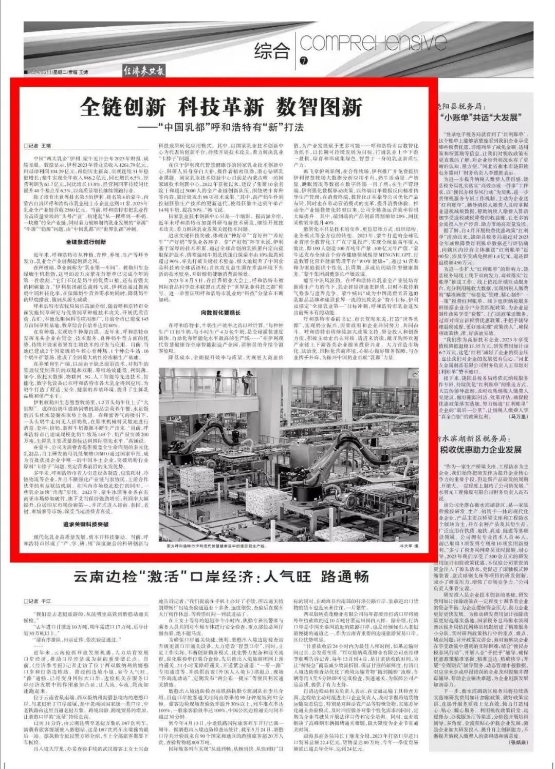 除了培育出世界排名第5的伊利、排名第8的蒙牛,内蒙古自治区呼和浩特市乳业链上市企业达到11家,2023年乳业全产业链营收2560亿元。当前,呼和浩特市把乳业作为高质量发展的“头号产业”,构建起“从一棵草到一杯奶、一块酪”的全产业链,同时着力破解制约乳业发展的“草源”“牛源”“奶源”问题,由“中国乳都”向“世界乳都”冲刺。