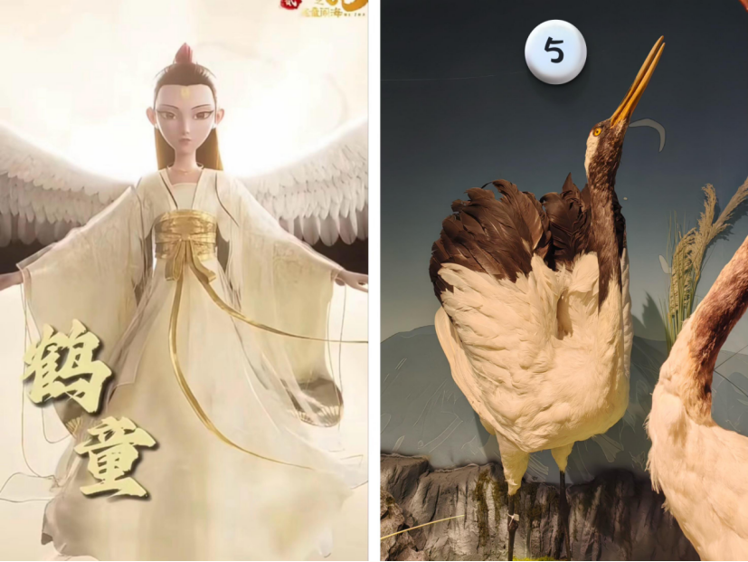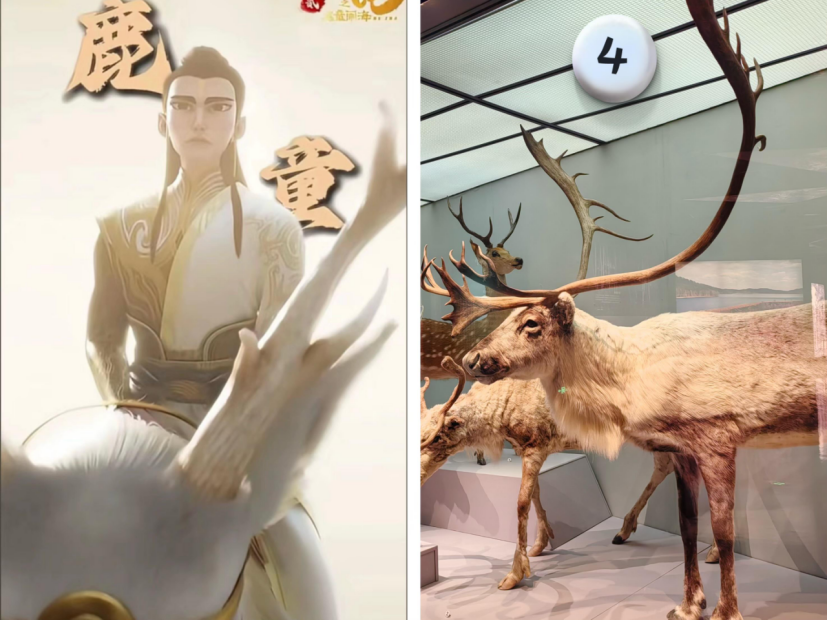 鹿是影片中“鹿童”的角色原型。在神话传说里,鹿都是各路神仙非常喜欢的坐骑,鹿常与仙鹤相伴,为人间带来福祉和长寿,有着吉祥的寓意。在博物馆里则有着被誉为“林海之舟”的驯鹿,驯鹿又名“角鹿”,是鹿科驯鹿属下的唯一一种动物。雌雄皆有角,长角分枝繁复,有时超过30叉;蹄子宽大,悬蹄发达;尾巴极短;身体上覆盖着轻盈但极为抗寒冷的毛皮。
