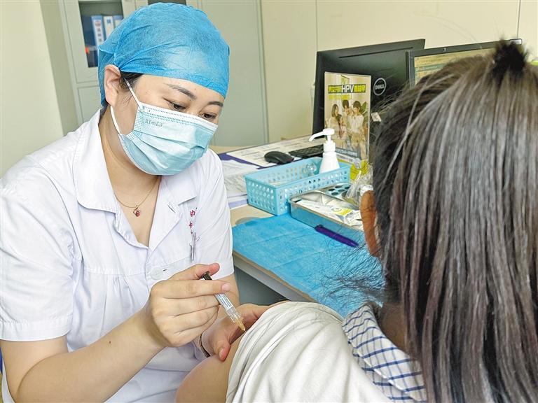 医护人员正在给一名10岁女孩接种HPV疫苗。