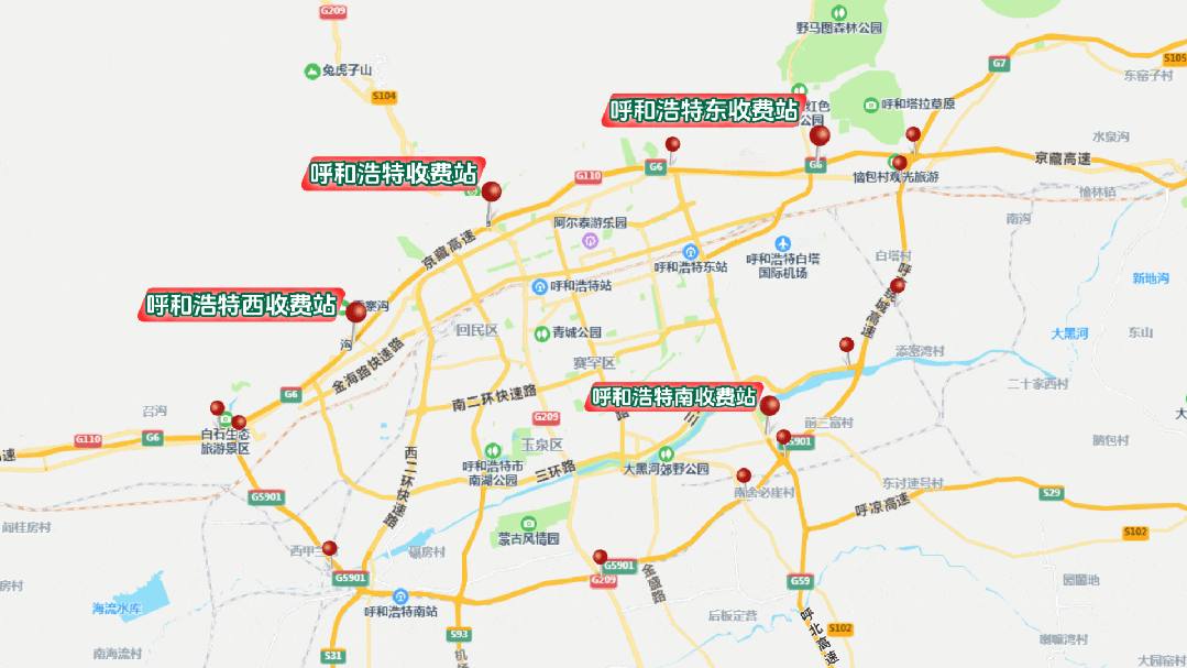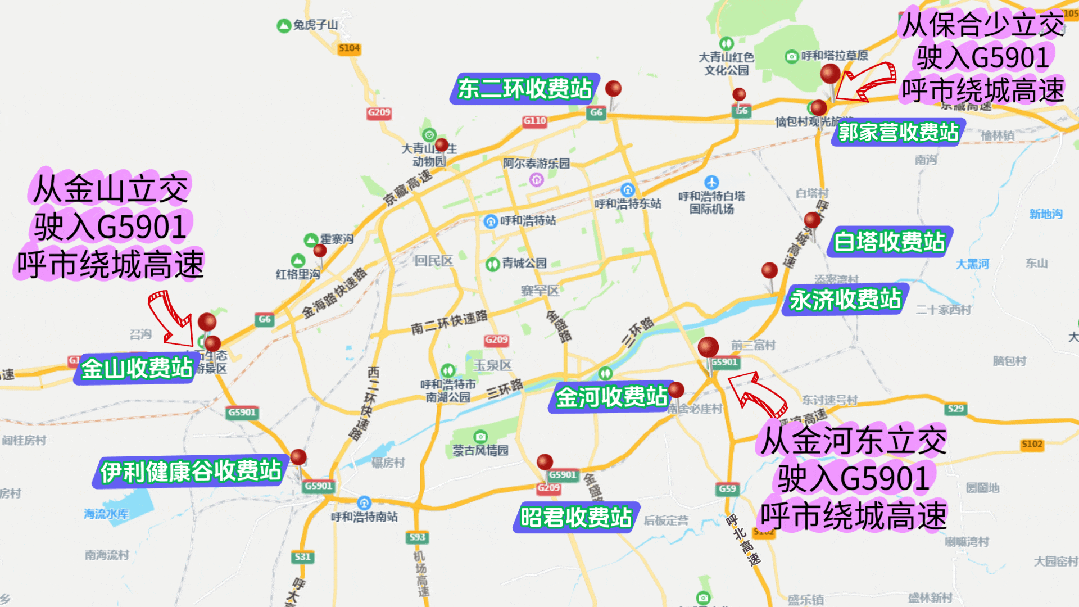 2、通过高速公路进入呼和浩特市区的车辆,建议选择G6 京藏高速东二环收费站及G5901呼市绕城高速各出口进入市区。